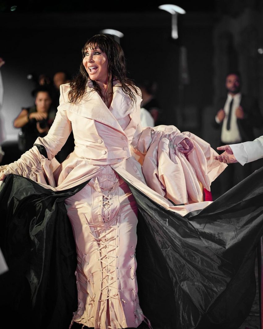 Moria Casán impactó con su estilo dramático en un look que prestó para toda una performance. En tono beige, vistió una chaqueta abotonada con mangas abullonadas y una sobre falda acampanada con cola XXL para luego develar un vestido con corset y acordonado, de caderas de impronta teatral y guantes negros largos.