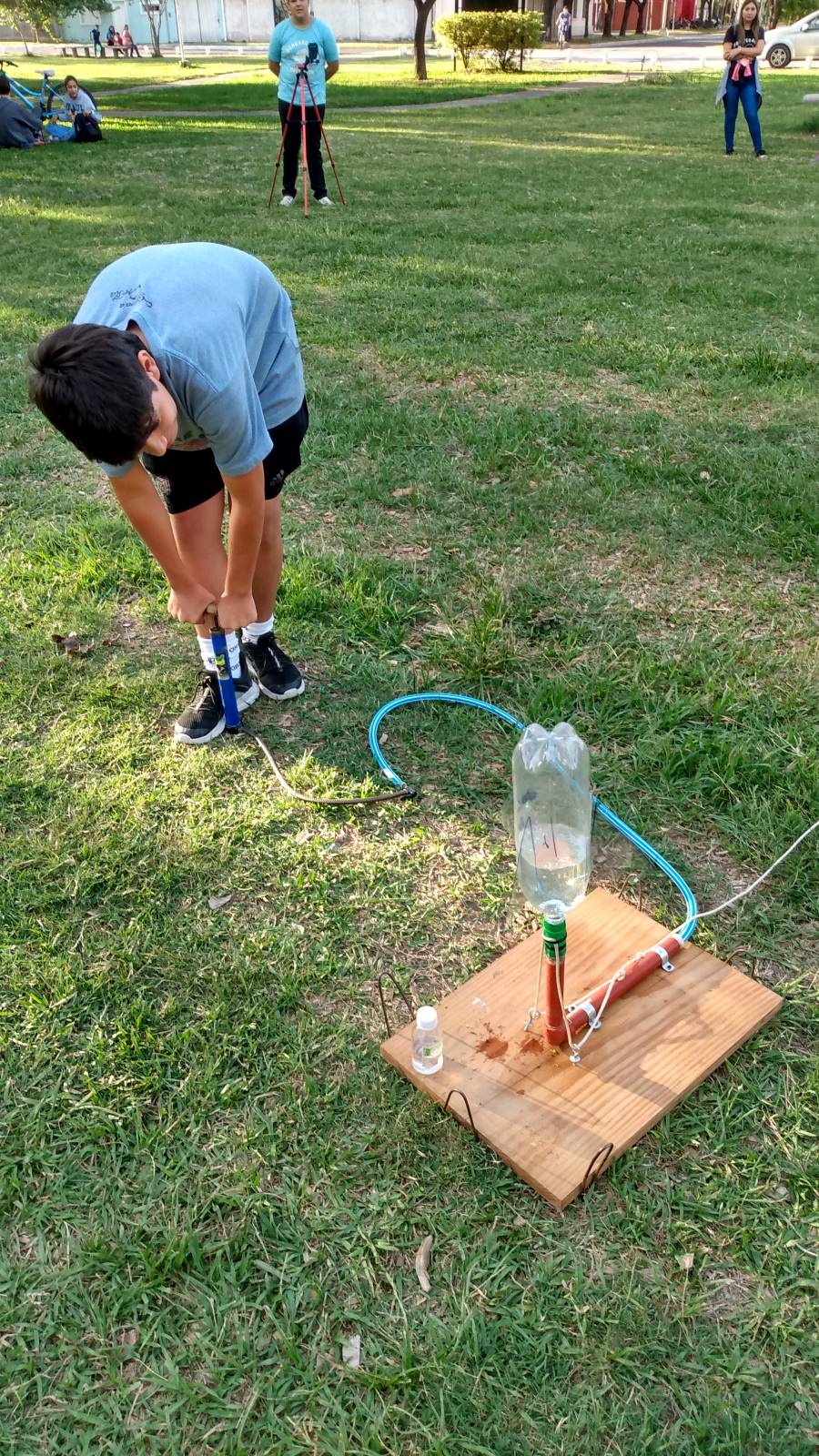 _ Este sábado tuvimos un pequeño taller donde explicamos el principio de funcionamiento de los cohetes de la vida real y realizamos una práctica aplicando esos conocimientos para hacer cohetes de agua, que son cohetes impulsados por agua a presión. Tanto los cohetes reales como estos que hicimos funcionan gracias a la tercera Ley de Newton que explica que para toda acción existe una reacción igual y en sentido contrario, y es eso un poco lo que queremos difundir con este tallercito. Tuvimos una muy linda participación de la gente que se dispuso a aprender un poco más y a divertirse un sábado a la tarde justamente con el armado los cohetes de manera simple y su funcionamiento; y lo más divertido de todo es el lanzamiento de los cohetes por lo que al final del taller terminamos probando los cohetes que hicimos. Algunos volaron, algunos no; algunos se mojaron y algunos no; pero todos se divirtieron de una u otra manera.