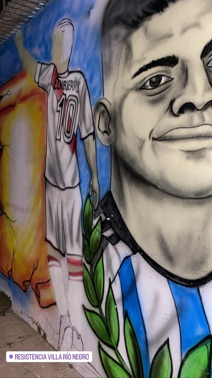 Todo quedó capturado por Mariela, la hermana del talentoso volante ofensivo, quien subió a sus historias de Instagram tanto el intercambio de Echeverri con sus seguidores como un imponente mural que pintaron los vecinos en una de las paredes del barrio. Ahí, se lo ve de fondo y bien grande con la camiseta de la Selección, junto a otro dibujo con la de River y, claro, la 10 que luce en la Reserva.