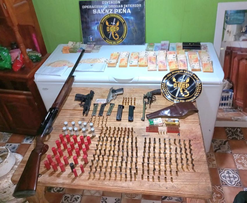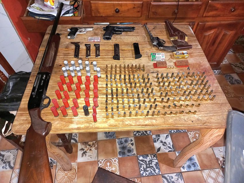 En la vivienda del principal investigado, un hombre de 36 años, se detectó un arsenal de armas entre las que se distinguen una escopeta calibre 12, un revólver calibre 38 con tambor de 6 alveolos, una pistola calibre 22 marca Bersa, con numeración adulterada y con 3 cargadores, un pistola 9 mm marca Pietro Beretta, sin numero de serie, con cargador para 15 cartuchos y otro con capacidad para 17, una gran cantidad de cartuchos de diferentes calibres entre los que se contabilizaron 39 cartuchos 12/70, 2 de calibre 14, 42 calibre 9mm, 13 casquillos percutados, 139 cartuchos 38mm, 90 municiones calibre 22mm y dinero en efectivo por la suma de $2.600.000.