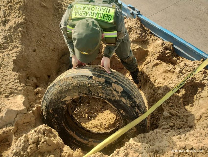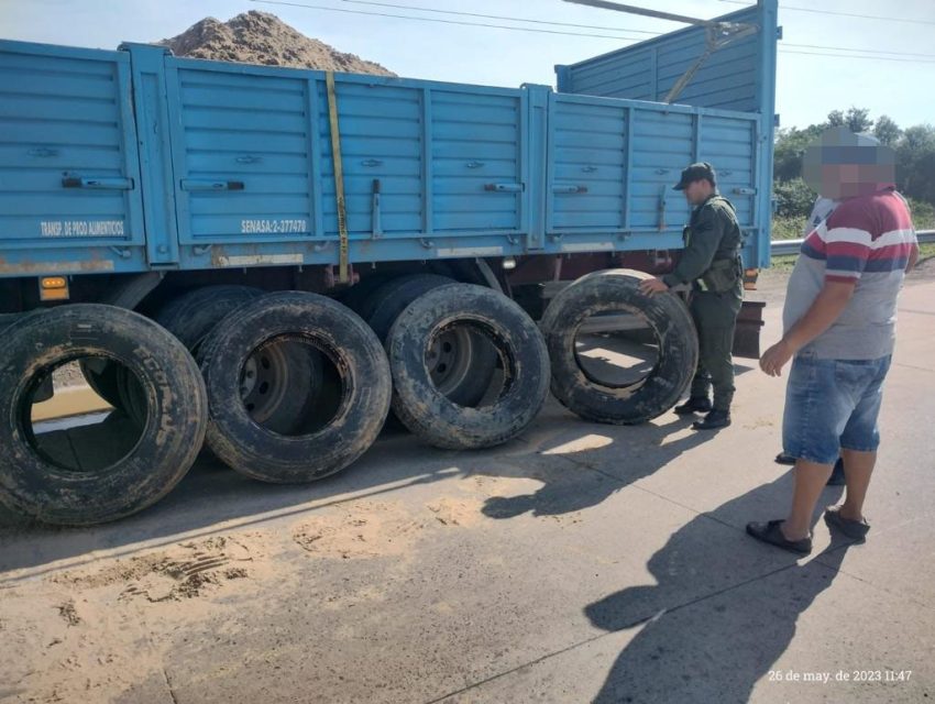 Al momento de la requisa del semirremolque del rodado, los funcionarios constataron que el mismo trasladaba arena. Asimismo, siguiendo con la inspección, detectaron seis neumáticos extranjeros sin documentación que avale su legal origen y tenencia, ocultos debajo del cargamento.