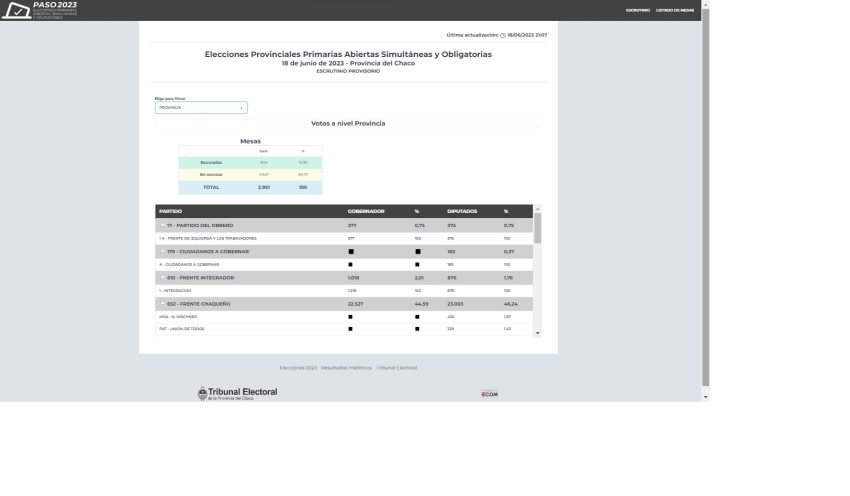 El Tribunal Electoral de la provincia del Chaco informó acerca del escrutinio provisorio que realizan este domingo 18 de junio, desde las 18, al término de las elecciones Primarias, Abiertas, Simultáneas y Obligatorias (PASO) en la provincia.