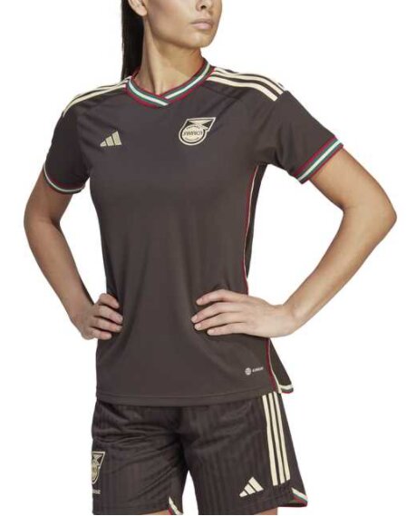 Inspirada en «los recuerdos colectivos de orgullo jamaicano», la camiseta de la selección jamaiquina fue confeccionada en colaboración con la marca de moda Wales Bonner, y «desprende un aire ochentero con su diseño a rayas y su vibrante contraste cromático», remarca la empresa.