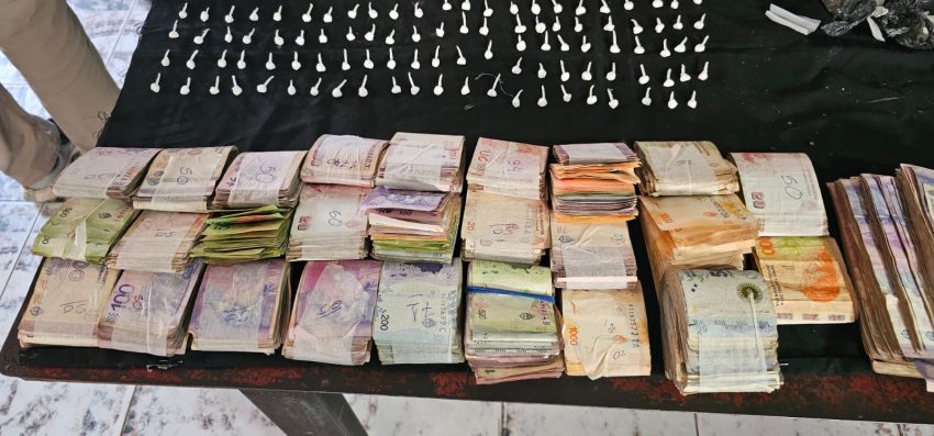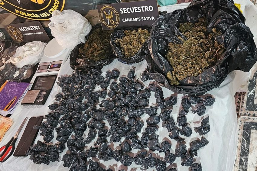 Luego en la inspección del inmueble, hallaron dos balanzas, recortes varios, tijera, anotaciones varias, dos bolsas con cogollos de marihuana, 121 bochitas con la misma sustancia, con un peso de 1306 gramos, además una bolsa con trozos compactos y 195 bochitas, todos con cocaína, con un peso de 611 gramos. Asimismo incautaron la suma de $225.280 pesos en efectivo.