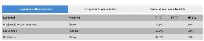 El ranking de temperatura de las 11, indicó que en la ciudad termal el termómetro llegó a 39,8°C, lo que le valió el primer puesto, por delante de Las Lomitas (Formosa), que tenía 39,6°C. En el tercer lugar quedó la Capital chaqueña, con 36,6°C.