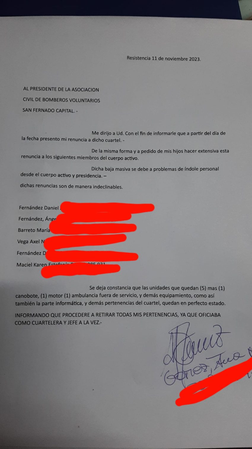 En las redes sociales siete integrantes de Bomberos San Fernando Capital Resistencia Chaco presentaron su dimisión. Pidieron la rendición de más de 10 millones de pesos y no aparece. Aseguran que los bonos que venden a la sociedad “es el gran negocio para unos pocos”.