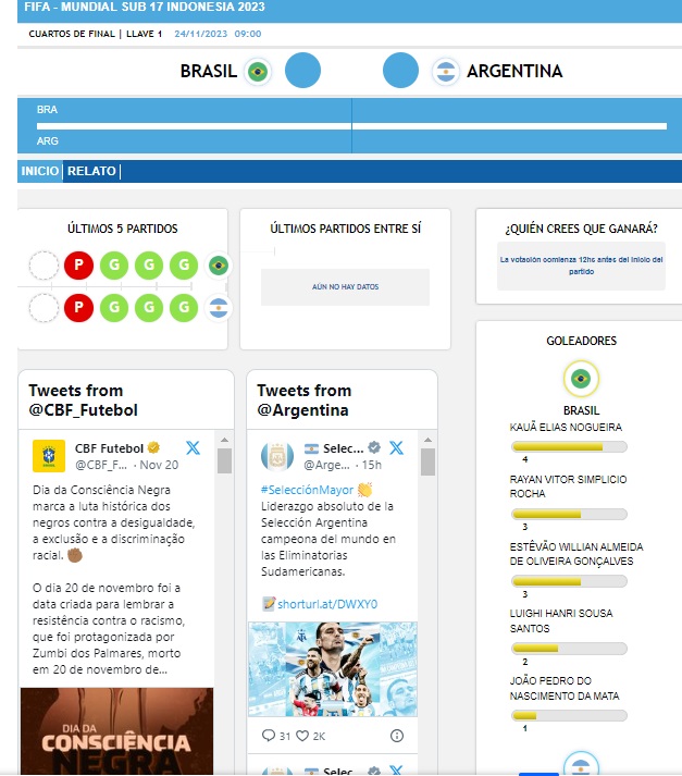 A ello se le suma que esta será la tercera ocasión en que se juega este clásico en un Mundial de la categoría y en las dos anteriores Brasil doblegó a Argentina: En Ecuador 1995, 3-0 en semifinales, y Egipto 1997, 2-0 en cuartos de final.