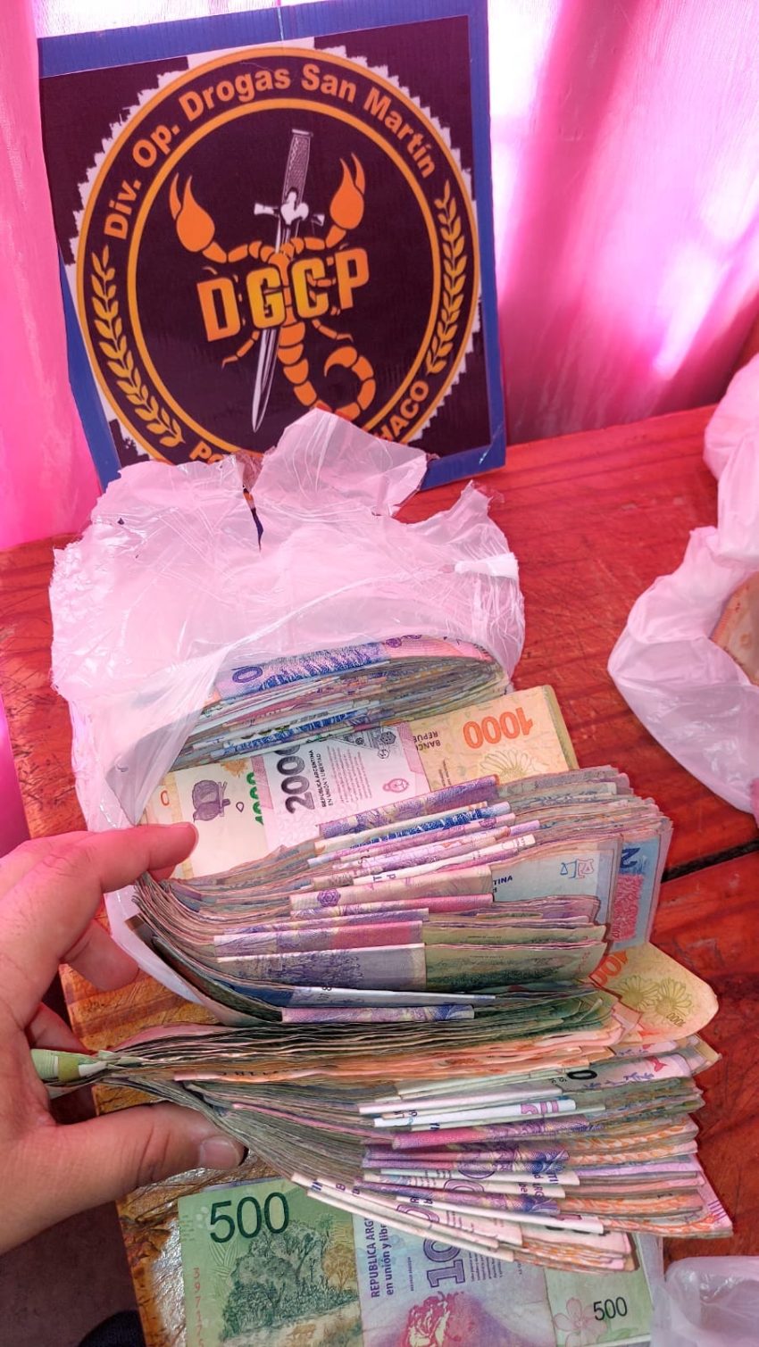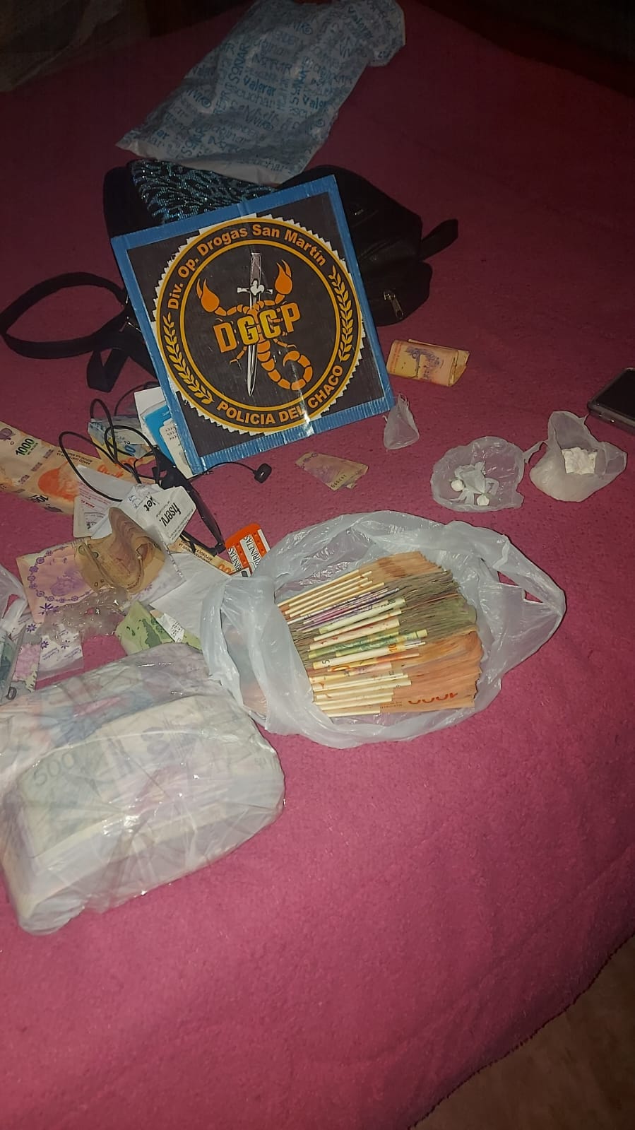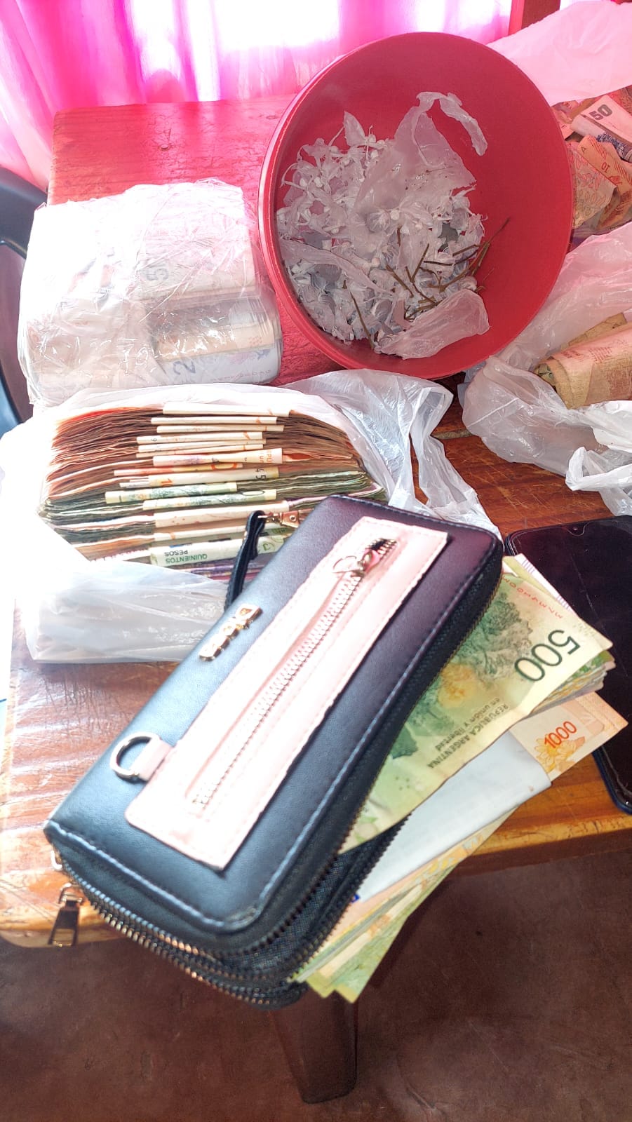 Asimismo, hallaron la suma de $659.640 en efectivo, una balanza digital, un celular, recortes de bolsas para la preparación de las bochitas y una motocicleta Corven Energy 110cc., color negra de dudosa procedencia.