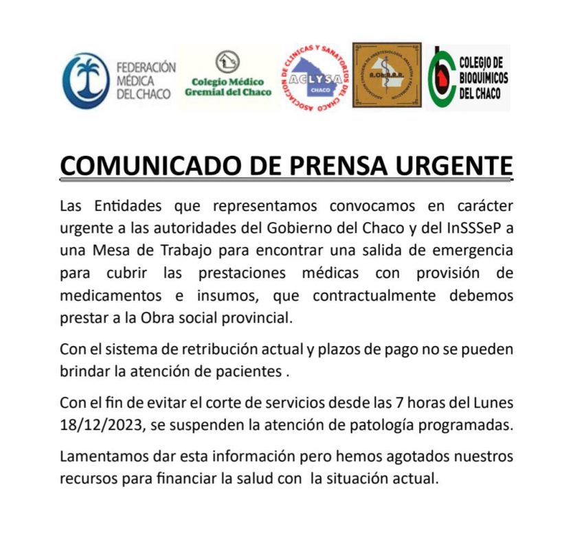 En medio de la gran crisis que se vive en la salud, desde la Federación Médica del Chaco, el Colegio Médico Gremial del Chaco, ACLYSA y la Asociación Chaqueña de Anestesiología, Analgesia y Reanimación y el Colegio de Bioquímicos emitieron este domingo un urgente comunicado respecto a las atenciones médicas programadas.
