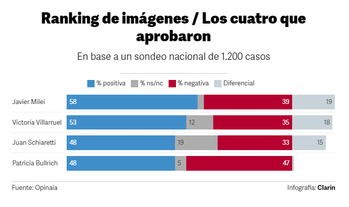 Los líderes de la tabla son el presidente y la vicepresidenta. Milei, con un diferencial de +19 puntos, y Villarruel, con +18.