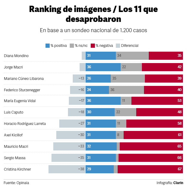 La expresidenta tiene la negativa más alta (67%), con una positiva debajo del 30%. Su balance en contra llega a 38 puntos.