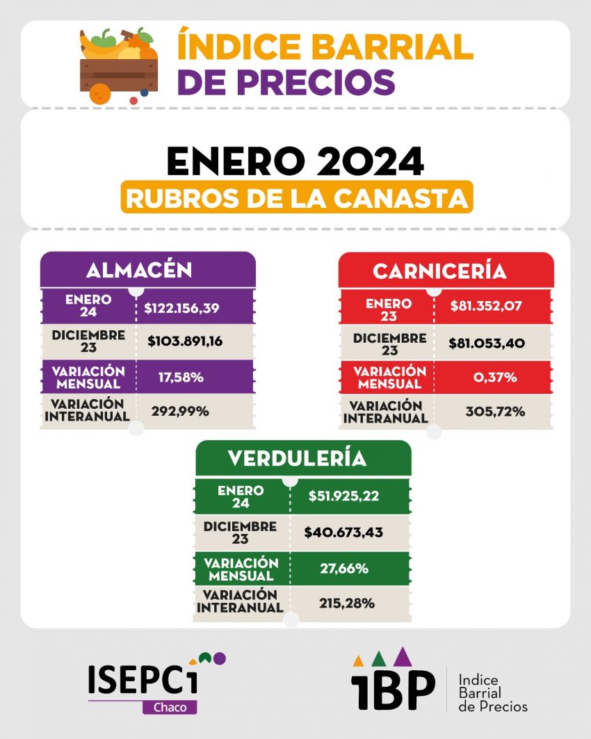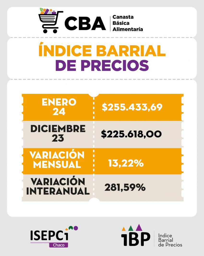 El Instituto de Investigación Social, Económica y Política Ciudadana (ISEPCi) brindó los datos del Índice Barrial de Precios de enero de 2024. El relevamiento realizado en los comercios barriales del Gran Resistencia y Sáenz Peña demostró un aumento del 13,22% en la Canasta Básica Total y Alimentaria.