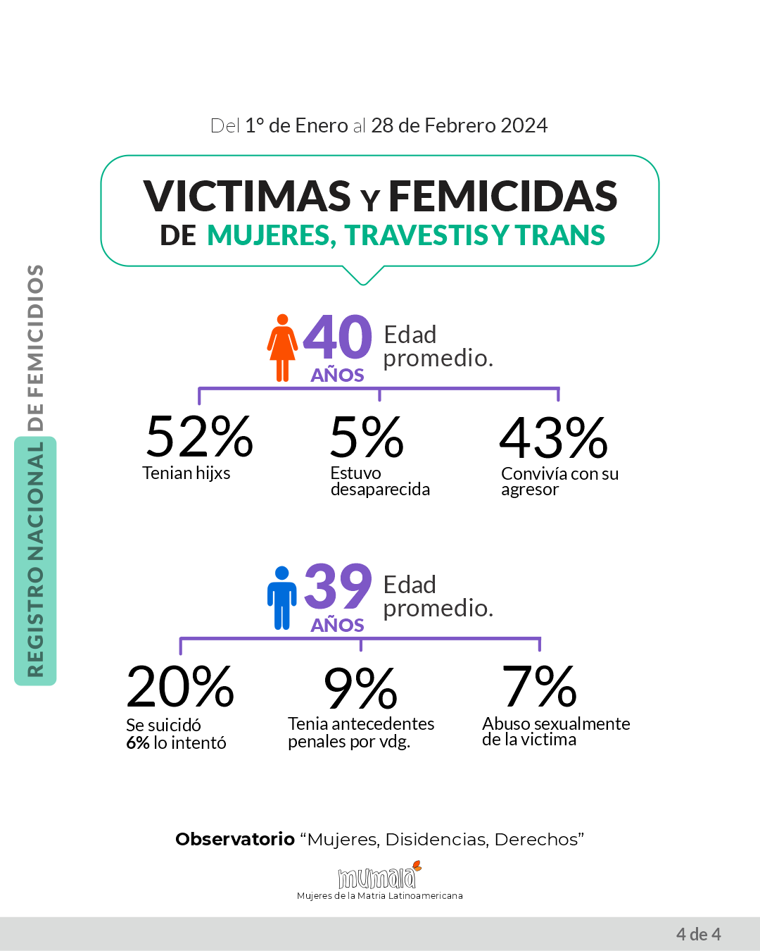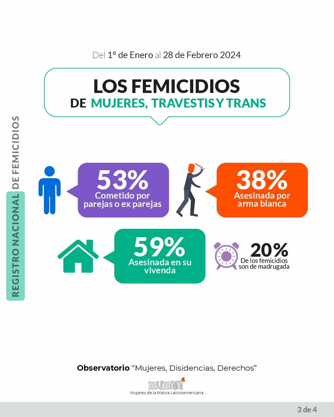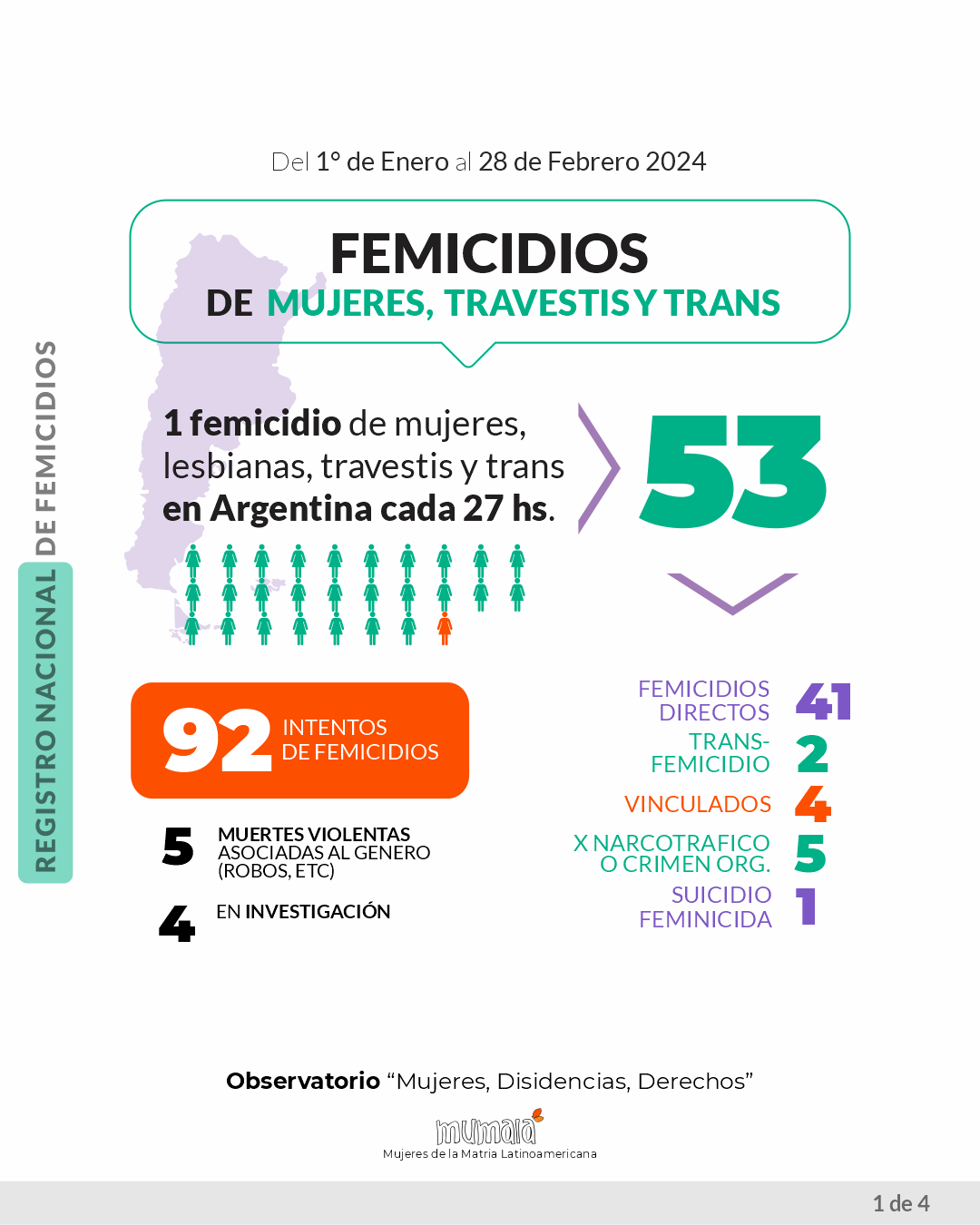 Según el Informe de Femicidios y Trans-Travesticidios del Observatorio de Mumalá «Mujeres, Disidencias, Derechos», se registraron 53 femicidios en nuestro país desde el 1ro de enero hasta el 28 de febrero de este año, un femicidio cada 27 horas. Además se reportaron 92 intentos de estos asesinatos por odio de género, lo que evidencia la situación de emergencia y urgencia que enfrentan las mujeres y disidencias en Argentina.