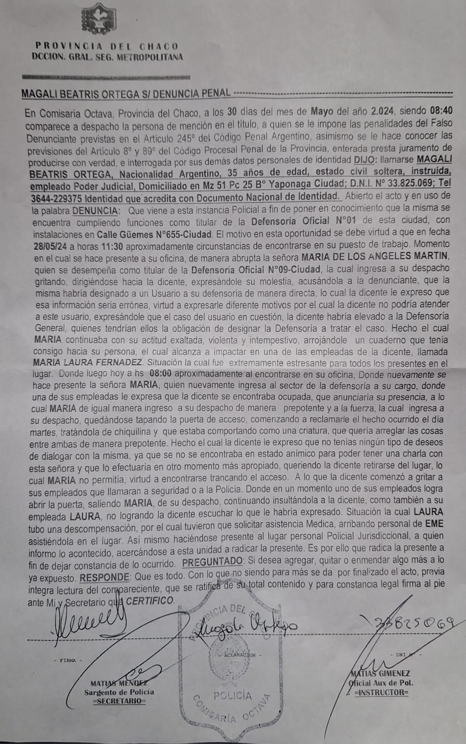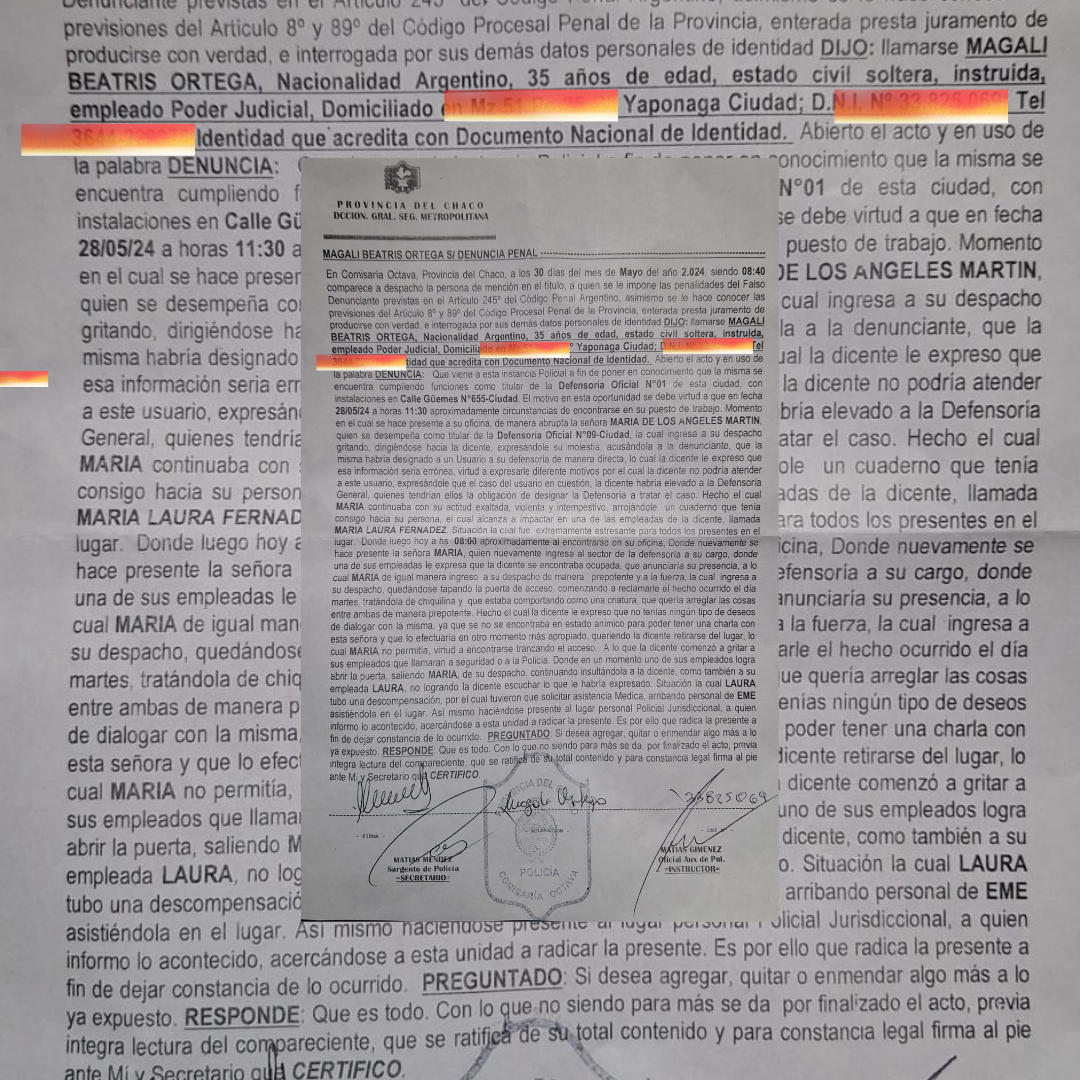 La Defensora Oficial 1 de Resistencia Magalí Beatriz Ortega denunció en la Dirección General de Seguridad Metropolitana este 30 de mayo a su par de la Defensoría 9 María de los Angeles Marin por una serie de agresiones que viene sufriendo en su lugar de trabajo.