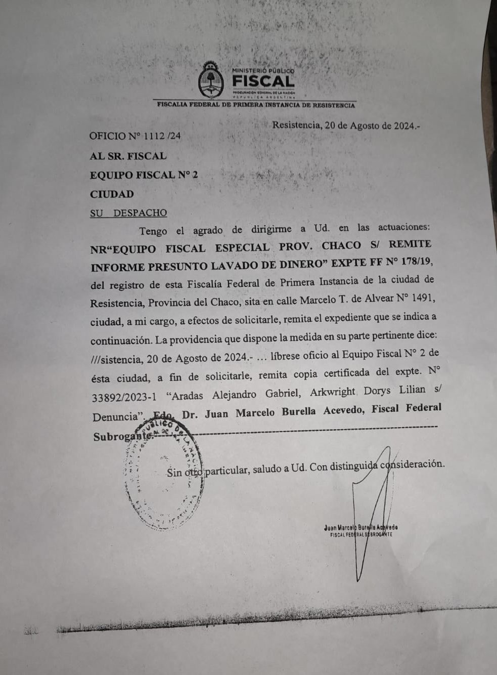 En ese sentido, el fiscal federal subrogante Juan Manuel Burella Acevedo solicitó al Equipo Fiscal Especial de la provincia del Chaco que le remita copia del expediente 33892/2023-1, relacionado con un presunto caso de lavado de dinero.