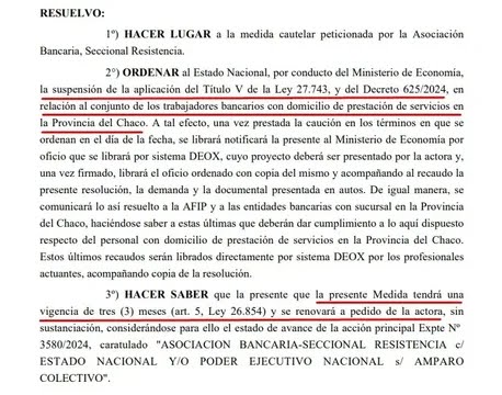 El fallo emitido el viernes por la jueza Zunilda Niremperger resolvió a favor de la petición de la Seccional Resistencia de La Bancaria, presentada por el dirigente gremial Rubén Belmar Ruffino, y suspendió por el término de 90 días la aplicación del gravamen a los trabajadores del sector, con la posibilidad de prorrogar el plazo hasta tanto se resuelva el planteo de fondo.