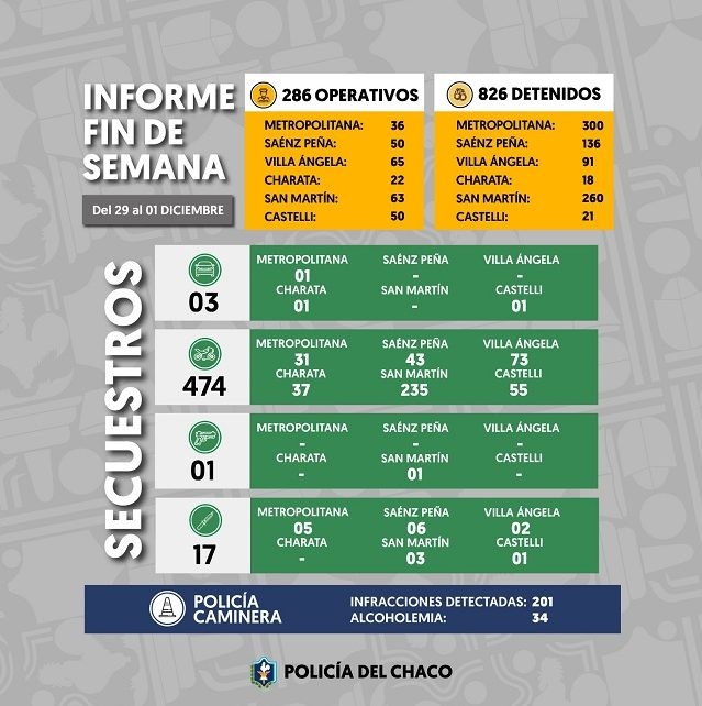 En Sáenz Peña, se llevaron a cabo 50 dispositivos que culminaron con 136 demorados, de los cuales 121 correspondieron a infracciones al Código de Faltas Provincial y 15 a delitos penales. También se incautaron 45 motos (dos con pedido activo) y seis armas blancas.