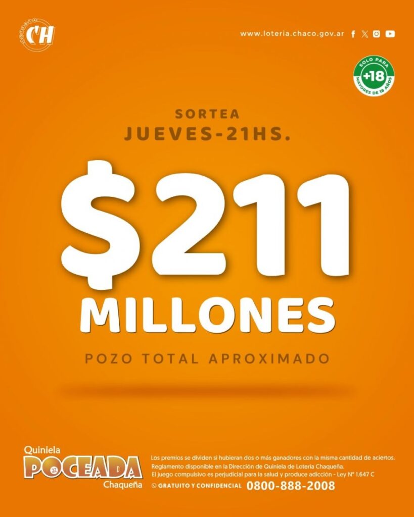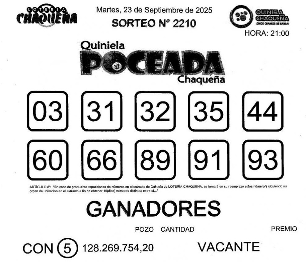 Anoche, en un nuevo sorteo de la Poceada Chaqueña, el pozo mayor de más de 128 millones de pesos quedó vacante. Nadie pudo acertar los 5 números: 03, 31, 32, 35, 44, 60, 66, 89, 91 y 93.
