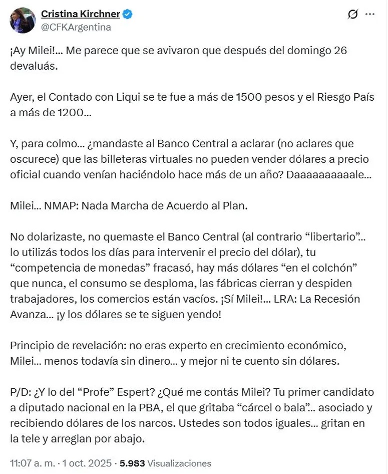 • El duro mensaje de Cristina Kirchner para Milei: «Se avivaron que después del domingo 26 devaluás»
