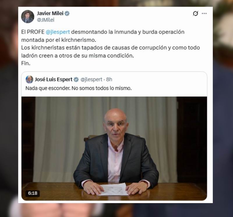 A través de un mensaje publicado en su cuenta de la red social X, el mandatario señaló: «El profe José Luis Espert desmontando la inmunda y burda operación montada por el kirchnerismo. Los kirchneristas están tapados de causas de corrupción y, como todo ladrón, creen a otros de su misma condición. Fin».