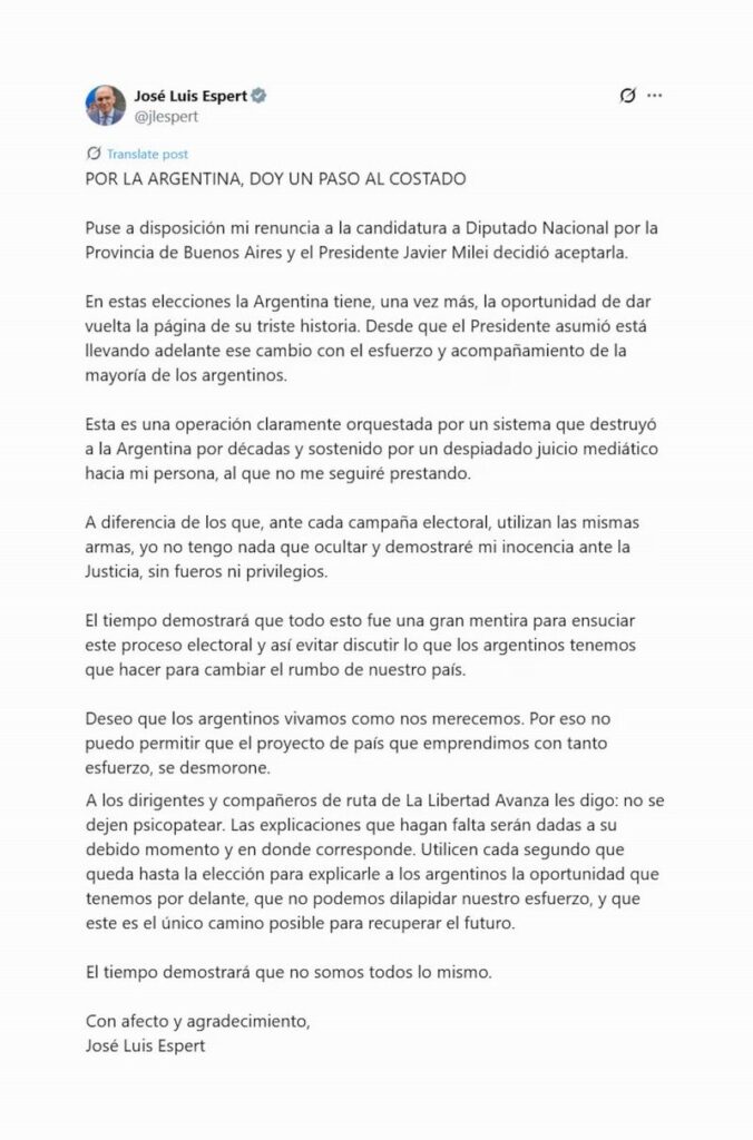 «Yo no tengo nada que ocultar, demostraré mi inocencia ante la Justicia», escribió Espert. A lo largo de la extensa publicación, y en sintonía con Milei, el titular de la Comisión de Presupuesto de la Cámara baja se refirió a una «operación orquestada por un sistema que destruyó a la Argentina por décadas y sostenido por un despiadado juicio mediático hacia mi persona, al que no me seguiré prestando».