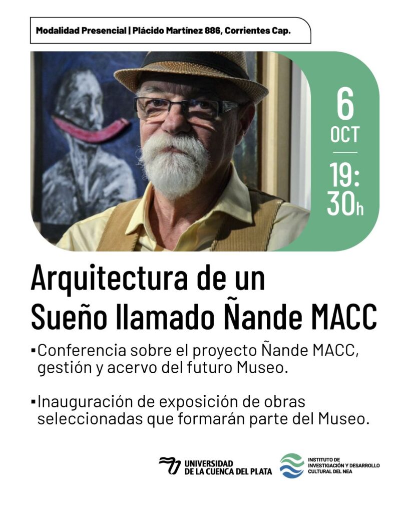 En la Universidad de la Cuenca del Plata, a través del Instituto de Investigación y Desarrollo Cultura del NEA, ubicada sobre Plácido Martínez 886, se realizará el encuentro titulado “Arquitectura de un Sueño llamado Ñande MAC”, una jornada que combinará arte, reflexión y gestión cultural, con entrada libre y gratuita.