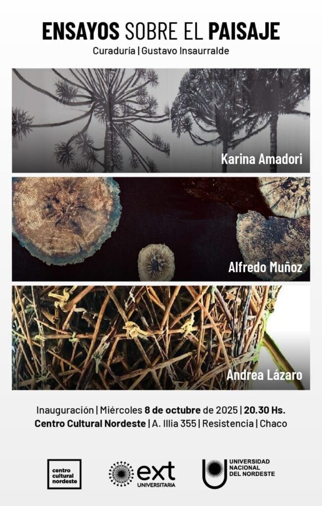 Este miércoles 8 de mayo, a las 20.30, se inaugura la exposición Ensayos sobre el paisaje en la Sala Iván Sagarduy del Centro Cultural Nordeste -Arturo Illia 355-. La muestra que se presenta es un proyecto expositivo que, con la curaduría de Gustavo Insaurralde, reúne tres obras: “Confesiones del tiempo” de Alfredo Muñoz (Salta, Argentina), “Inmanencia latente” de Karina Amadori (Curitiba, Brasil) y “Dame refugio” de Andrea Lázaro (Buenos Aires-Francia).