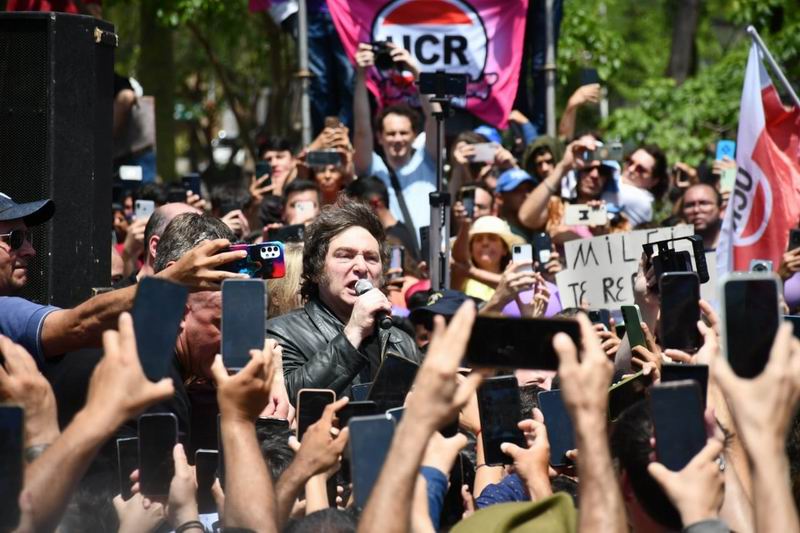Con un amplio operativo de seguridad instalado en las adyacencias de la laza Belgrano, Milei llegó alrededor del mediodía para dar su respaldo a los candidatos a senadores y diputados nacionales de La Libertad Avanza de cara a las elecciones nacionales del próximo domingo 26.
