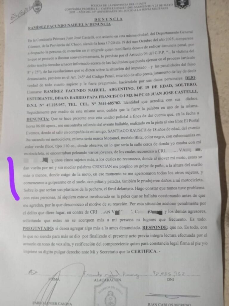 El joven aclaró que no tenía conflictos previos con los agresores ni participó en la riña inicial. “Desconozco el motivo de su reacción”, expresó en la denuncia, en la que manifestó su decisión de iniciar acciones penales contra los identificados C.V., C.R. y los demás involucrados.
