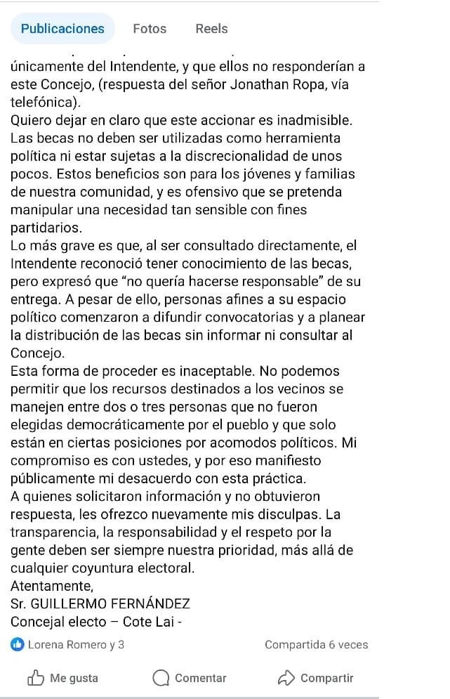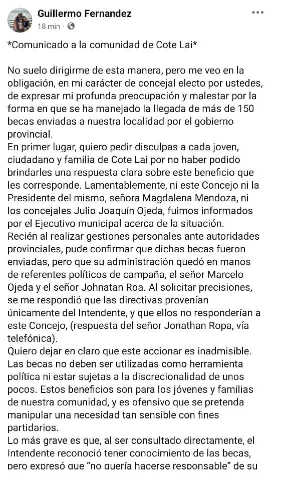 En un comunicado dirigido este lunes a la comunidad, el concejal radical de Cote Lai, Guillermo Fernández, expresó su profunda preocupación y malestar «por el uso político de beneficios destinados a jóvenes y familias, por parte del gobierno provincial».