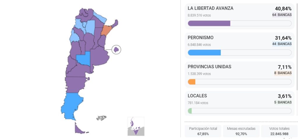 La Libertad Avanza gana las elecciones para la Cámara de Diputados en Buenos Aires, CABA, Chubut, Corrientes, Córdoba, Entre Ríos, Jujuy, La Rioja, Mendoza, Misiones, Neuquén, Río Negro, Salta, San Luis, Santa Fe y Tierra del Fuego.