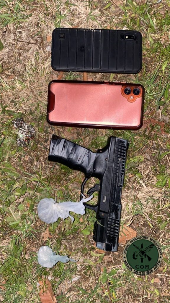 Cuando el personal de la Sección C.O.M. interceptó la motocicleta —una Guerrero 110 cc negra, sin luces y con faltantes en el carenado— identificó al conductor, un adolescente de 17 años, y a su acompañante, un joven de 18. Durante el cacheo preventivo, los agentes encontraron entre las pertenencias del joven mayor una réplica de arma de fuego tipo pistola 9 milímetros.