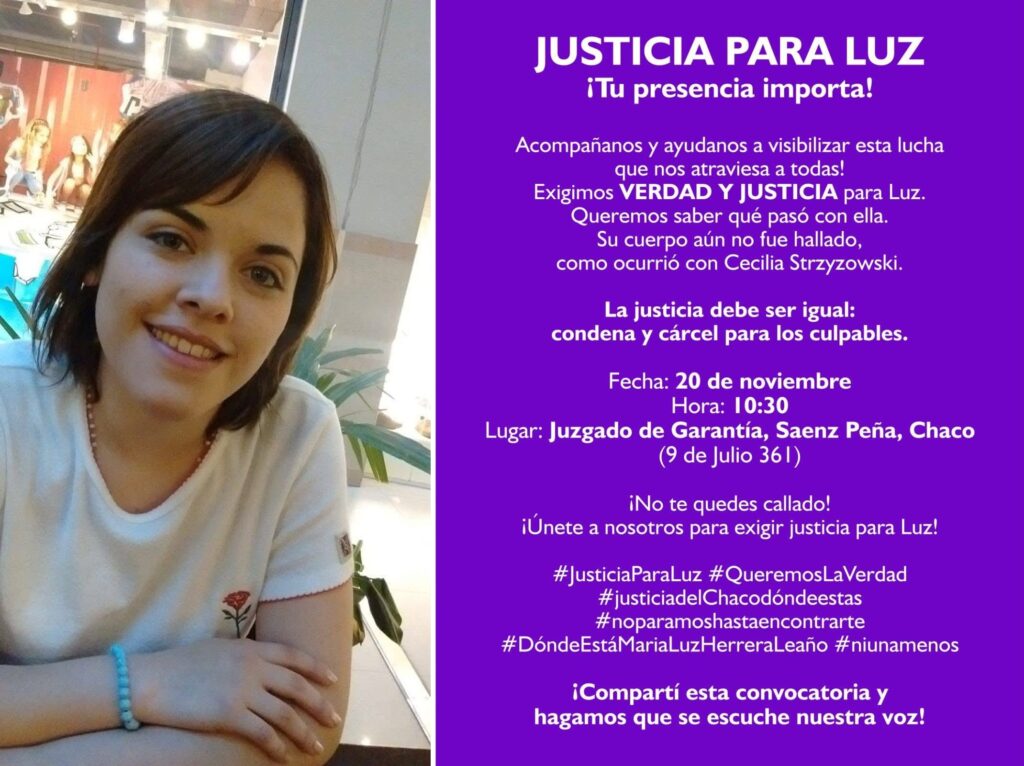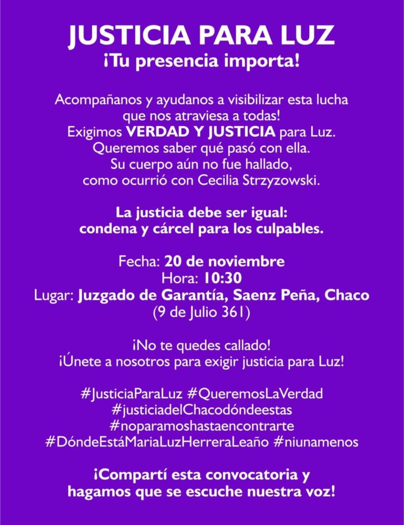 En paralelo con las convocatorias, el caso de María Luz Herrera, la joven jujeña de 26 años desaparecida el 26 de septiembre de 2023 en Sáenz Peña, atraviesa semanas decisivas. La causa, que se investiga como presunto femicidio, podría quedar pronta para juicio.