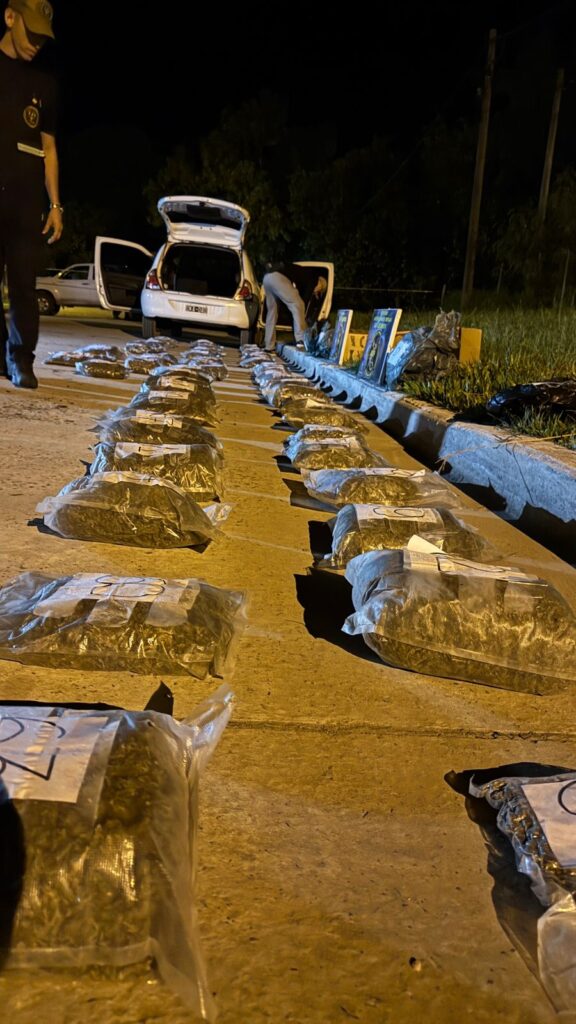 Ante esa situación se dispuso un operativo cerrojo en los accesos y rutas vecinales. Como resultado, el vehículo fue localizado en el barrio Teresa y su conductor intentó huir a pie, siendo alcanzado y demorado. Con testigos presentes, verificaron el interior del rodado, hallándose 66 paquetes termosellados con 53,3 kilos de cogollos de marihuana, además de documentación de interés para la causa, con un valor estimado cercano a los diez millones de pesos.