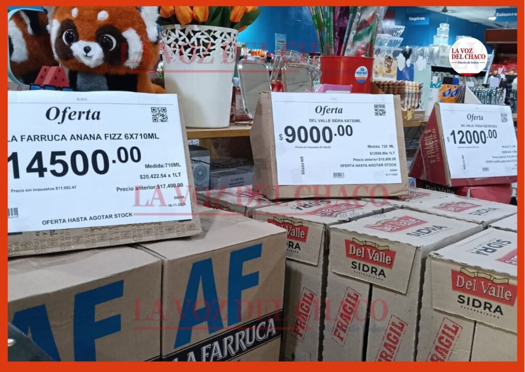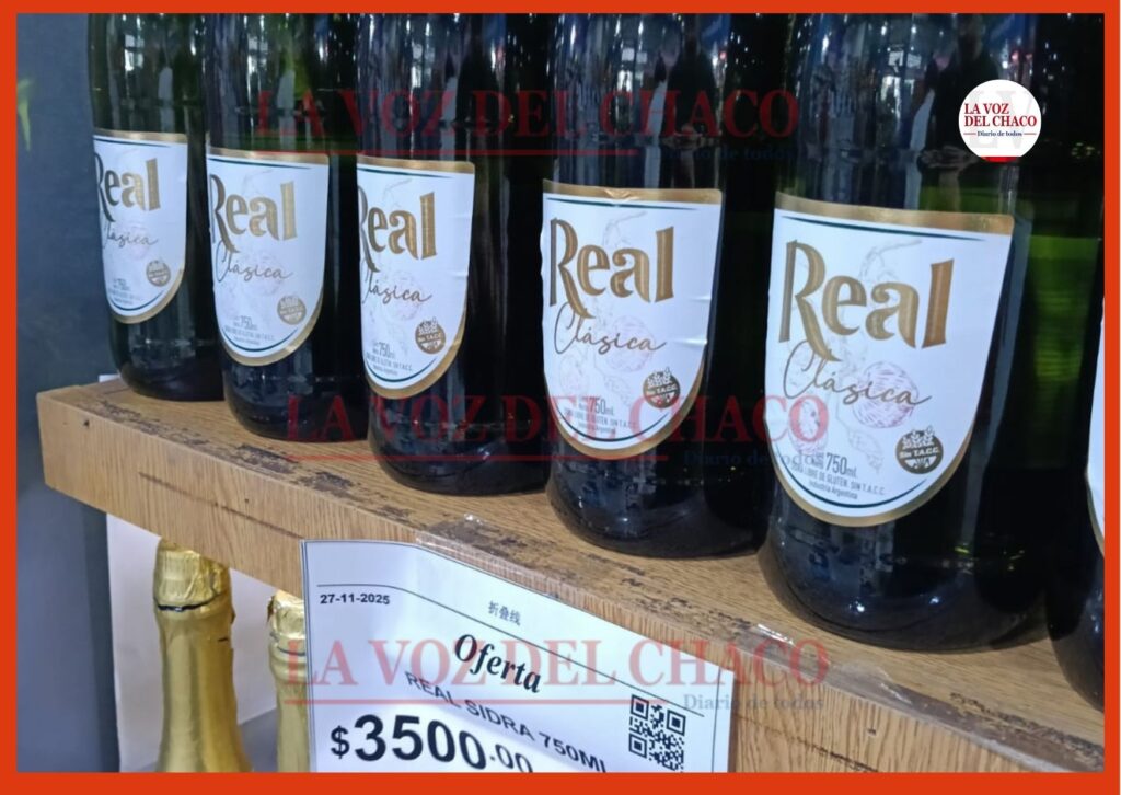 Durante el recorrido se observaron valores diversos en bebidas, panificados, dulces y canastas armadas. Las sidras, uno de los productos más tradicionales, presentan una fuerte dispersión: una sidra Real clásica de 750 ml se ubica en $3.500, mientras que la La Farruca de 710 ml se consigue por $2.500 en oferta.