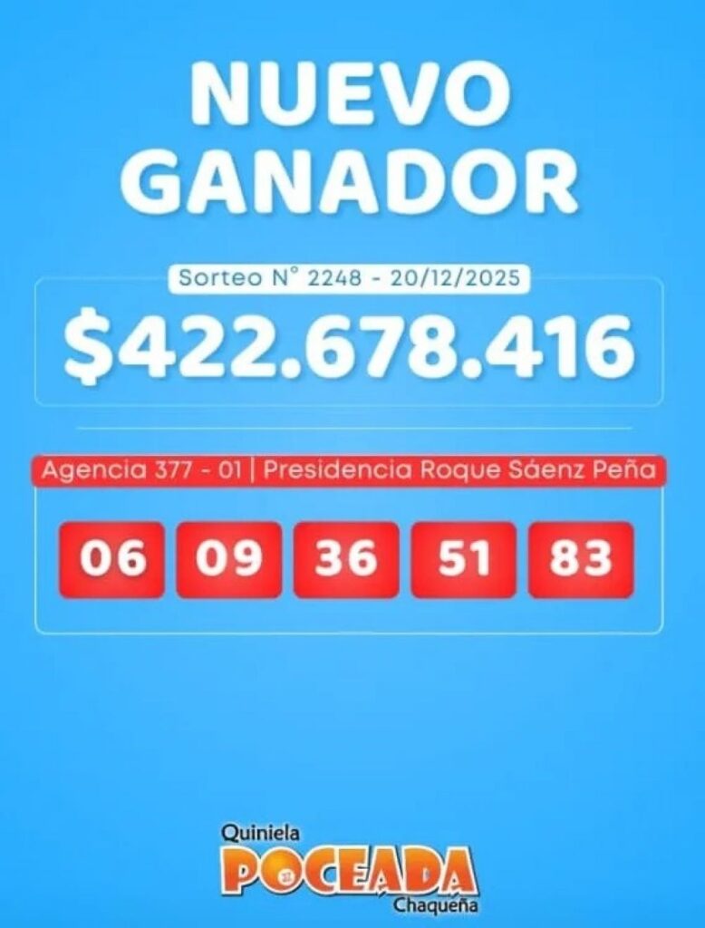 La combinación ganadora estuvo integrada por los números 06, 09, 36, 51 y 83, lo que permitió al afortunado jugador alzarse con un premio exacto de $422.678.416. La apuesta fue realizada en la Agencia N° 377 – 01 de Presidencia Roque Sáenz Peña, que quedó marcada por vender uno de los premios más importantes de la historia reciente del juego.