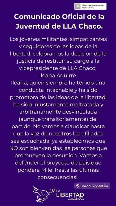 En un fallo que sacude la estructura interna de La Libertad Avanza (LLA) en el Distrito Chaco, la Justicia Electoral hizo lugar al planteo de nulidad presentado por Ileana Leticia Aguirre, quien había sido desplazada de su cargo partidario tras una cuestionada acta labrada en agosto de este año. Mirá el comunicado que compartió la juventud con La Voz del Chaco.