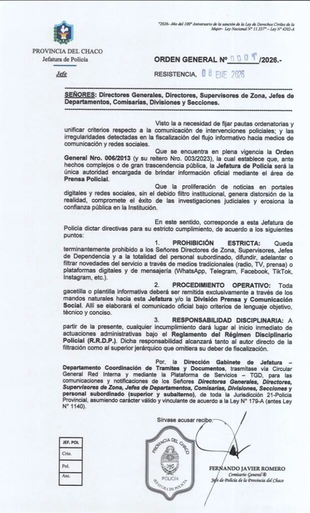 El mismo se establece que ya no se podrá brindar información directa a los medios de comunicación, y que toda novedad policial deberá ser difundida exclusivamente a través del área de Prensa de la Policía del Chaco, según publicó el portal Más Contenidos.