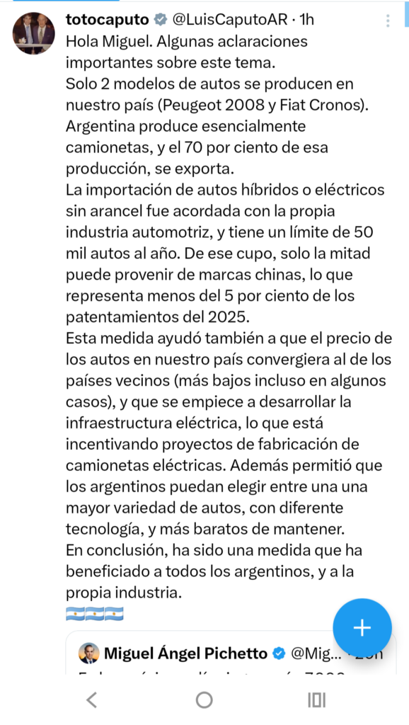 El ministro de Economía, Luis ‘Toto’ Caputo, salió al cruce con una serie de aclaraciones técnicas y defendió la medida. Según explicó, en Argentina solo se producen dos modelos de autos —el Peugeot 2008 y el Fiat Cronos—, mientras que la industria automotriz nacional está mayormente enfocada en la fabricación de camionetas, de las cuales el 70% se exporta.