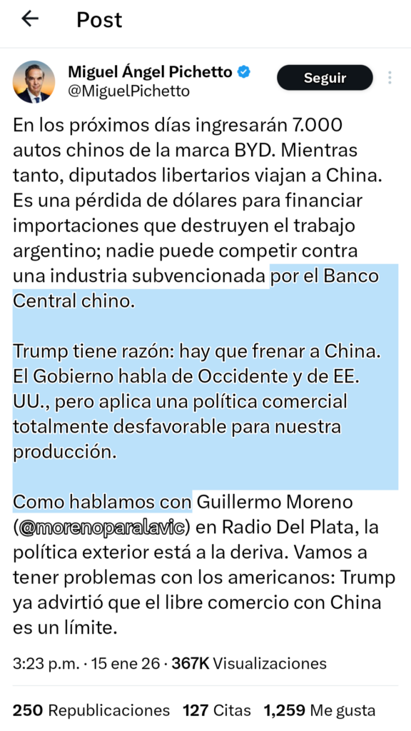 El diputado Miguel Ángel Pichetto advirtió que en los próximos días ingresarán al país unos 7.000 autos de la marca china BYD, mientras que legisladores libertarios viajan a China, lo que consideró una contradicción con el discurso oficial.“Es una pérdida de dólares para financiar importaciones que destruyen el trabajo argentino. Nadie puede competir contra una industria subvencionada por el Banco Central chino”, sostuvo Pichetto en X, al cuestionar el impacto de estas operaciones sobre la producción nacional.La respuesta no tardó en llegar.