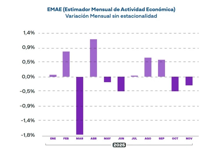 El documento, elaborado a partir de los datos del Estimador Mensual de Actividad Económica (Emae), señala que en noviembre la actividad registró un retroceso del 0,3 por ciento en términos desestacionalizados, encadenando dos meses consecutivos de variación negativa y confirmando, según el análisis, un contexto de estancamiento económico.