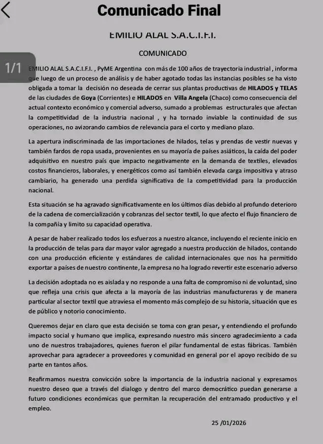 La empresa Emilio Alal S.A.C.I.F.I. anunció el cierre definitivo de sus plantas productivas de hilados y telas en la ciudad de Goya, Corrientes, y de hilados en Villa Ángela, Chaco. La firma informó la decisión oficialmente a través de un comunicado. De esta manera, una PyME argentina con más de 100 años de trayectoria industrial, se suma a las miles de empresas que ante el crecimiento de las importaciones y la crisis de consumo, cerraron sus puertas en todo el país.