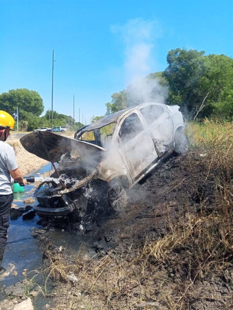 Minutos después, dotaciones de bomberos trabajaron intensamente para extinguir las llamas y evitar que el incendio se propagara hacia los pastizales cercanos, en un sector donde la vegetación seca podría haber agravado la situación.