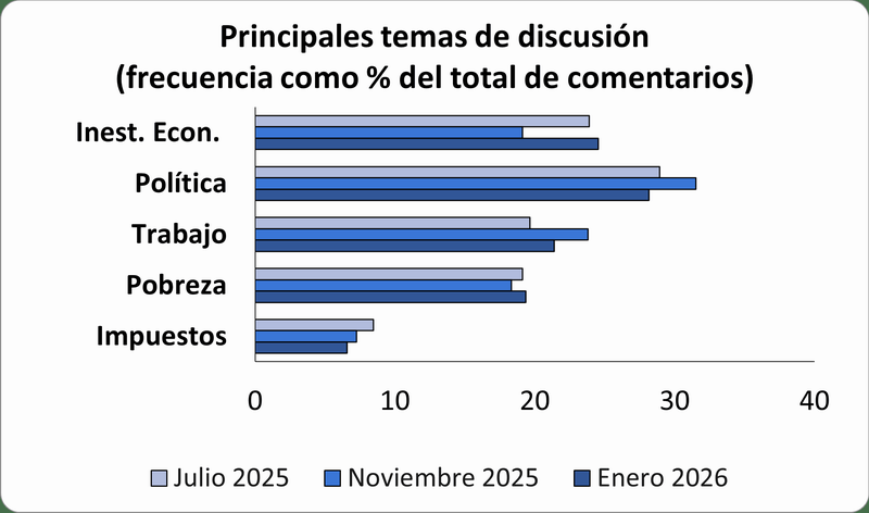 En enero de 2026, el universo de mensajes analizados mostró, además, un reordenamiento temático. Tras el paso de las elecciones, las discusiones sobre política y trabajo retornaron a valores más moderados, con participaciones del 28,2% y 21,4%, respectivamente, sobre el total de mensajes asociados a la incertidumbre.