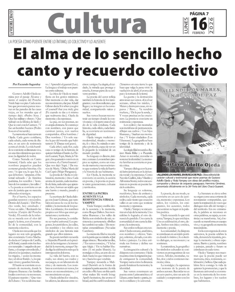 «ALLENDE LOS MARES, EN BUSCA DE PAZ». Obra editorial de carácter cultural y testimonial que reúne poemas de Gustavo Adolfo Ojeda y Yirala Yampey con obras del prolífico músico, compositor y director de orquesta paraguayo, Herminio Giménez, presentada oficialmente en la 26° Feria del Libro Chacú-Guaraní.