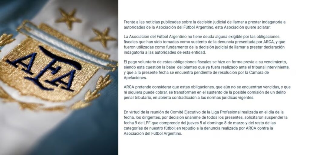 La Asociación del Fútbol Argentino (AFA) emitió un comunicado oficial en el que aclaró su situación fiscal y confirmó que AFA suspende la fecha 9 de la Liga Profesional y del resto de las categorías en repudio a la denuncia presentada por ARCA.