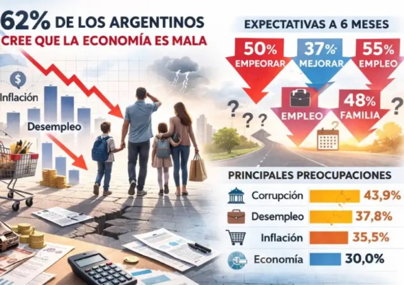 El diagnóstico sobre el presente es contundente. Según el relevamiento, el 62% de los argentinos califica como mala la economía del país, mientras que apenas el 22% la considera buena.