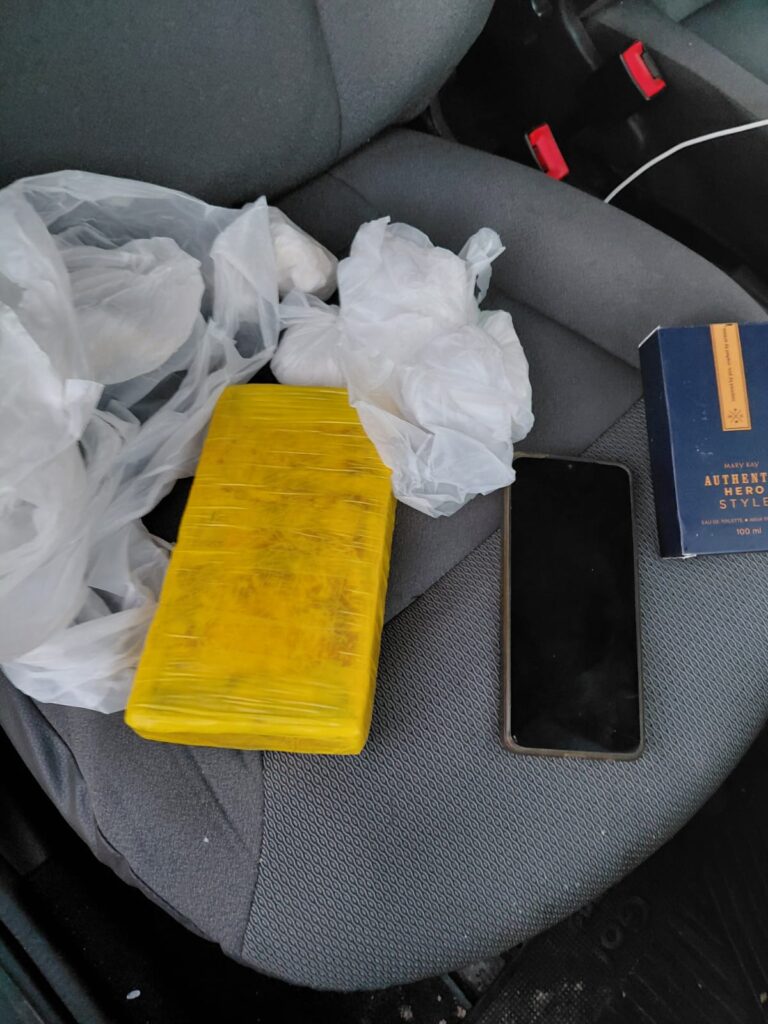 Durante la inspección del vehículo, los agentes detectaron una mochila negra ubicada en el asiento delantero. En su interior hallaron un paquete rectangular de color amarillo y tres bolsas de polietileno con una sustancia blanquecina. Tras la intervención de la División Microtráfico y la prueba de campo correspondiente, se confirmó que se trataba de cocaína, con un peso total de 1,477 kilogramos.