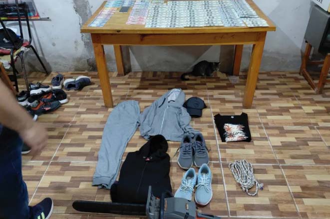 Tras tareas investigativas y análisis de cámaras de seguridad, se concretaron allanamientos en distintos domicilios, donde se logró la aprehensión de los sospechosos y el secuestro de cartuchos, dinero en distintas monedas, celulares, prendas de vestir, un automóvil y una escopeta.