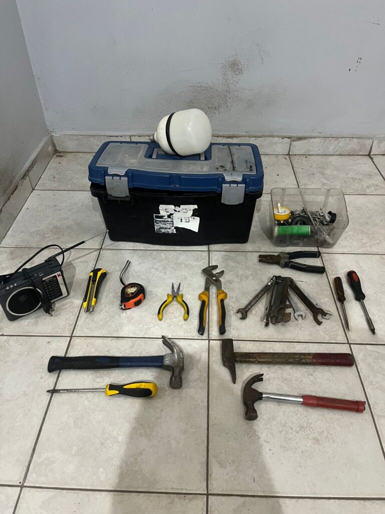 Al momento de la detención, el joven tenía en su poder diversos objetos que llevaba dentro del bulto: un foco LED, un radiograbador marca Akita, una caja de herramientas y varias herramientas de mano, entre ellas martillos, pinzas, destornilladores, una trincheta, una cinta métrica y un manojo de llaves.